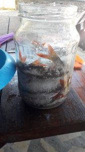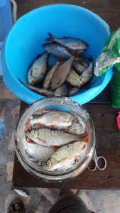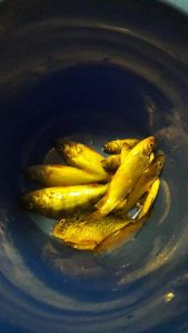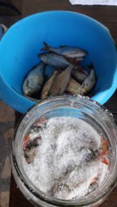 Pești de dimensiuni mici (biban, biban soare, cărăşel, roşioară, babuşcă), sare.