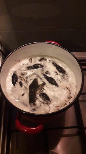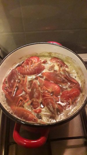 Pe când pregăteam acest soi de mâncare m-a dus mintea la cântecul lui Mărgineanu (și nu l-am dus până la capăt). Varianta completă aici. Titlul este o glumă. În realitate este vorba doar de raci. Am pregătit acest fel pentru că este o rețetă simplă, cu ingrediente simple şi puţine, potrivită traiului în natură. Unde trebuie să profiți de toate resursele disponibile. Din aceste motive, cum i-am văzut în pescărie, i-am și cumpărat. Deși am mai gătit și pe cărbuni, prăjiți etc. de data asta au fost făcuți în bere, după rețeta lui Păstorel Teodoreanu. Din Gastronomice. Cartea poate fi găsită în varianta electronică aici.