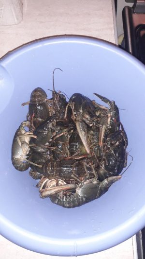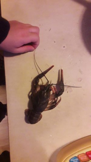 - se spală racii în mai multe ape pentru a fi curățați de mâl etc. Acum se scoate segmentul din mijloc al cozii, cu intestinul gros (prima fotografie; e și mâna copilului acolo). Cu această ocazie am descoperit că doi raci muriseră. I-am dat deoparte. Cică doar cei vii se pregătesc. Informație luată din două surse. Din carte (cărți) și de la vânzătoare. Au ajuns jucării excelente pentru copii (fotografia de mai jos);