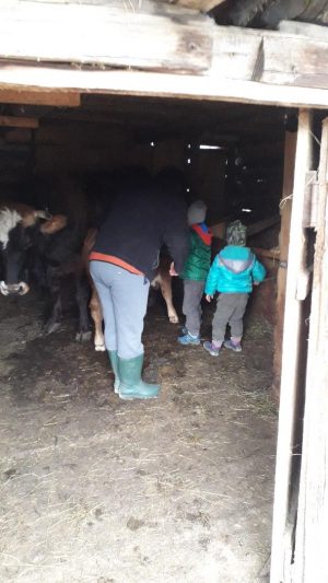 Peisajul este extraordinar. Copiii erau mult mai încântaţi decât noi, adulţii. Dar, din păcate, am văzut și lucruri mai puțin plăcute. Din care avem cu toții de tras învățăminte. De exemplu, pe lângă noi a trecut o familie, unde era și un sugar purtat în brațe, o familie extinsă, alcătuită din soț, soție și alte rude, cam cinci adulți, şi încă un copil mai măricel (7-8 ani). Nu aveau nimic asupra lor. Nici măcar o sticlă de apă. Ce să mai vorbim de haine sau de o pelerină de ploaie. Ce ar fi făcut cu copilul dacă începea să plouă? Tocmai din aceste motive vrem să îi obișnuim pe ai noștri copii cu natura, cu animalele, cu viața la țară. Să nu fie rupți de realitate, ancorați doar în cea din oraș ori, mai rău, să fie pierduți în lumea virtuală. Drept dovadă, în fotografia de mai jos se văd voiniceii în grajd cum se duceau să pună mâna pe vițel. Poate atunci când vor fi adulți or să-și aducă aminte. Și m-or judeca mai puțin.