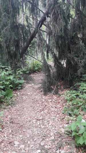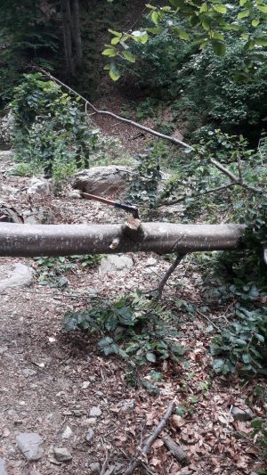Un alt aspect care e bine să fie în drumeție este setul de unelte. Drept urmare, toporașul pe care îl am la mine mereu când plecăm în natură a fost pus la treabă pentru a elibera drumul. Un copac era căzut în potecă. A trebuit să tai una dintre crengile lui (prima imagine de mai jos) pentru a permite trecerea mai uşoară peste trunchi. Am uitat să fac fotografii înainte de a tăia creanga dar nu am mai uitat în cel de-al doilea caz. După cum se poate vedea în a doua fotografie de mai jos unde un molid aplecat peste potecă încurca trecerea pe sub el. Și acolo am folosit toporașul pentru a ușura trecerea.