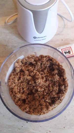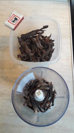 Pentru obţinerea pemmican-ului, se pune carnea uscată la chopper pentru a fi mărunţită. În trecut, la mama lor (America), era mărunțită cu ajutorul pietrelor ca în fotografia de mai jos. A fost luată de pe https://oyasin.io/pemmican-recipe/. Pentru că societatea a evoluat … merge a fi mărunţită şi cu chopper-ul.
