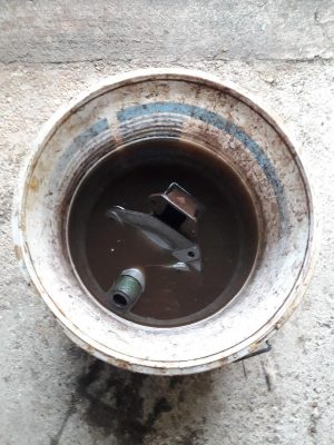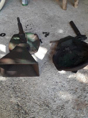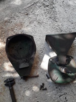 Moara a fost demontată. Surprinzător de ușor au ieșit șuruburile din locașul lor. În interiorul morii cred că mai erau resturi de făină. Se poate vedea în fotografiile de mai sus. Cine știe de când erau acolo. A fost curățată de resturi și introdusă, pe părți componente, în găleata cu oțet. Și a luat ceva până a fost curățată de rugină. Părțile erau scoase din găleată frecate cu peria de sârmă și șmirghel și băgate la loc. De mai multe ori. Când erau ok, se spălau cu apă, se ștergeau bine cu o cârpă și erau date cu WD-40. Urma altă parte componentă. Până când au fost curățate toate părțile. A fost folosit oțet de vin. Am văzut pe internet opinii care susțineau că este indicat să fie folosit oțet alb. Am încercat cu cel de vin. Mi s-a părut că merge.