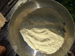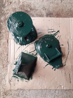 După o perioadă a urmat vopsirea. Când s-a uscat vopseaua, moara fost asamblată la loc. Și așa m-am ales cu o moară funcțională. Care este posibil să mă țină mută vreme. Și nu am recondiționat-o degeaba ori să am cu ce mă făli pe aici. Am pus-o la treabă și a ieșit o făină de mălai din care am făcut o mămăligă de toată frumusețea. Se poate vedea făina împrăștiată pe masă și pe moară în prima fotografie din titlu. Povestea va fi pusă într-un articol viitor.