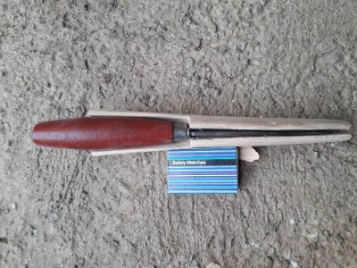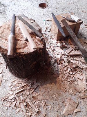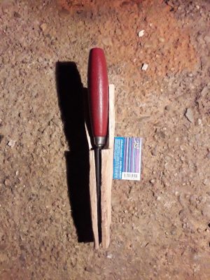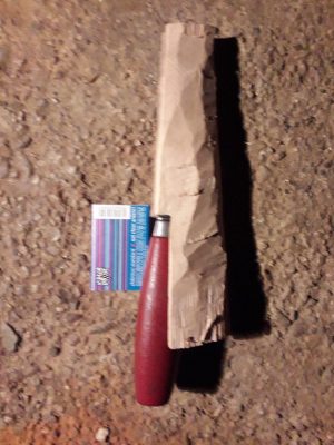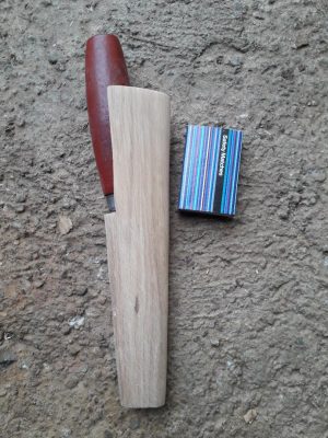 Primul pas a fost alegerea lemnului. A fost aleasă o bucată fără fisuri. A fost cioplită cu barda până aproape de dimensiunile finale. Apoi, se taie cu fierăstrăul locașul pentru lama cuțitului. Se lărgește cu cuțitul de cioplit.