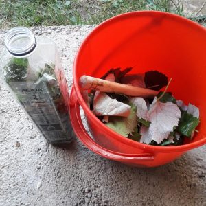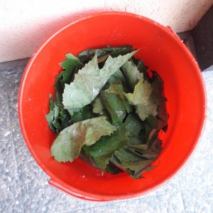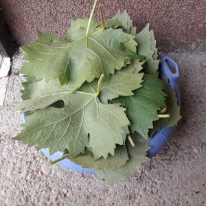 Frunzele de viță de vie au fost tăiate cu grijă, cu foarfeca de vie, pentru că via era în floare. Să nu se scuture. Bine nu-i este. Au fost culese într-un lighean mic. Pentru spălat, am trecut la o găleată. După ce au fost spălate în mai multe ape, frunzele au fost scurse şi li s-a dat o mână de sare. Se lasă să ia sare. Pentru conservare, se trece la introducerea frunzelor într-un pet de plastic. Se pune un strat de sare pe fundul sticlei. Se rulează fiecare frunză şi se introduce în sticlă. După ce au fost băgate câteva, cu melesteul de lemn se îndeasă. Se pune un strat de sare. Se reia procesul, rulat, introdus, îndesat, strat de sare. Ultimul strat de sare a fost mai gros. A fost pus capacul și depozitată la rece. Treaba-i gata. Ce-o să iasă din toată povestea asta? Vedem. Peste câteva luni.