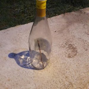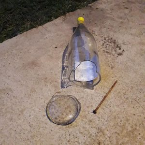 Primul pas constă în spargerea sticlei. Pentru asta, se introduce un cui în ea, cu floarea (capul) în jos, precum în fotografie. Se pune degetul mare în gura sticlei şi se agită bine. Fundul se va desprinde precum în fotografia următoare. Ideea nu-mi aparţine. Am luat-o de aici. Un alt jupân, în domeniu, este cel de aici.