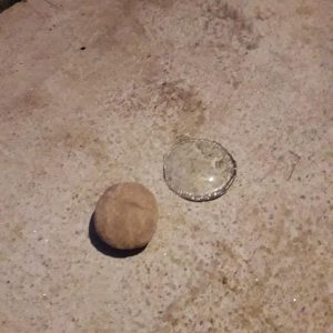Pentru vârful nostru de suliţă, se trece la cioplirea fundului de sticlă (din el se face vârful) cu ciocanul de piatră. Cu ciocanul cu capul de cupru a fost cioplit până la o formă apropiată de cea finală. Cu ajutorul retuşorului, se ciopleşte vârful de suliță în forma finală. Și asta a fost tărășenia cu vârful de suliță.