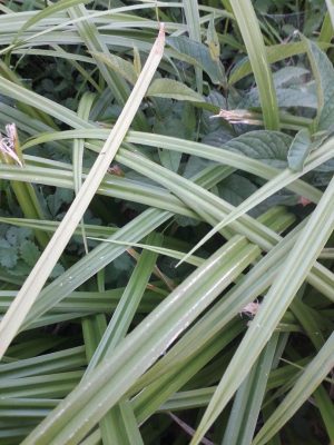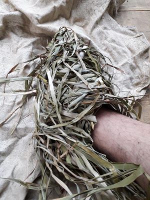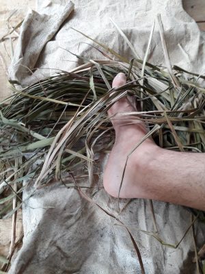 Am folosit planta din genul Carex. Acum, de care Carex o fi, nu știu. Tradițional i se spune rogoz. Am luat ideea de la populația Sami. În sursele aflate pe internet se susținea că ei foloseau astfel de plante în încălțările lor drept ciorapi. Rogozul a fost cules în timpul verii și pus la uscat în podul casei.