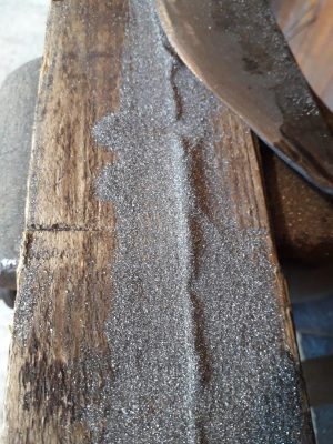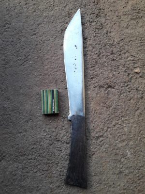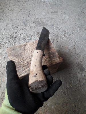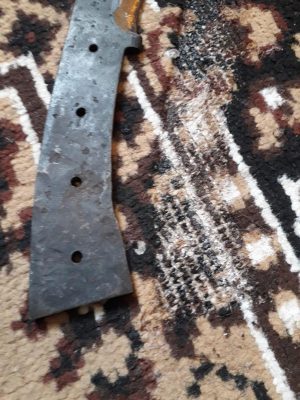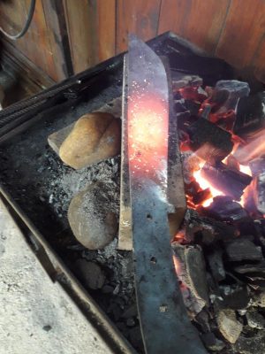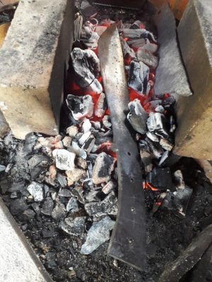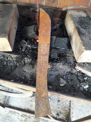 Nu s-a realizat ușor. Focarul forjei e prea mic. Pentru înroșirea lamei pe toată lungimea a trebuit să fac foale cum aveau fierarii ambulanți rromi ce cutreierau satele copilăriei. Dintr-un sac de plastic, o bucată de țeavă și sârmă. Surprinzător de eficiente sunt foalele. Cu ajutorul lor a fost înroșită lama pe toată lungimea. Pentru că a fost introdusă toată în ulei ars, cu vârful în jos (n-am recipient potrivit, să fie călit doar tăișul) maceta s-a strâmbat puțin. Cât era caldă a fost îndreptată cu ciocanul pe bușteanul de lemn.