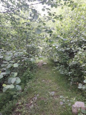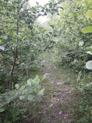 Ce s-a dorit odată cu confecționarea ei? O unealtă utilă. Asta s-a vrut a fi, o unealtă. Nicidecum un obiect de artă. Oricum, nu va câştiga vreodată un concurs de frumuseţe. N-am priceperea necesară şi nici nu doresc să o am pentru a face astfel de lucruri. Modelul meu, în ce privește fierăria, este fierarul satului din copilărie. Cel care cu puține unelte reușea să facă multe lucruri. Utile. Nicidecum ca acum când se urmăresc mai mult lucrurile frumoase. Iar uneltele sofisticate folosite ar lăsa fără grai unul din fierarii menționați. Se mai pot vedea astfel de fierari prin diferite locuri din lume. Unul este aici și aici. Motivul realizării și portului unui obiect tăietor lung se poate vedea în fotografia de mai jos. Drumul este cotropit de vegetație. Pe acolo treceau maşinile folosite la exploatarea forestieră. Acum abia mai este de o potecă. Însă exemplul este cam slăbuț. Au mai fost și alte situații când aproape că nu puteai trece prin unele locuri. În pădurile copilăriei mele, păduri bătrâne de stejar și fag, cu copaci rari, nu prea era nevoie de macetă. Decât să cari așa ceva după tine mai bine ocoleai locurile pe unde nu se putea trece. Însă azi, când s-a taiat atât de mult din codrii țării, în multe locuri e diferită treaba. Au apărut lăstărișuri, mărăcinișuri, de uneori parcă e imposibil de trecut prin ele. Mai ales copiii.