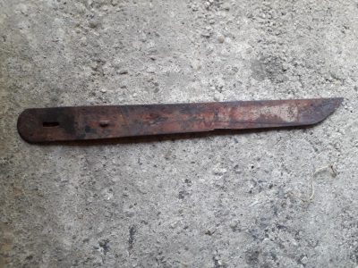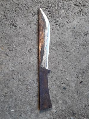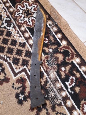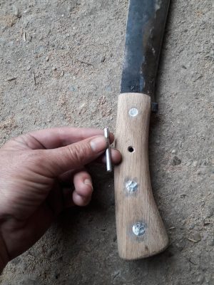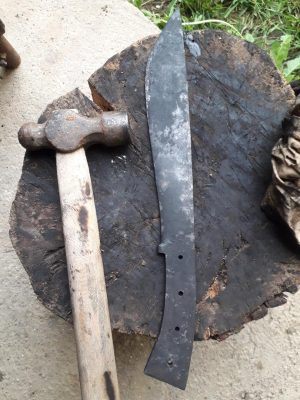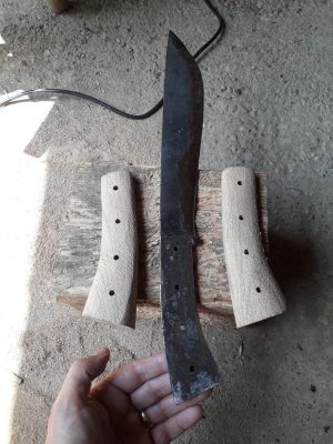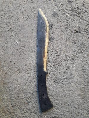 Fiind mai lungă decât era necesar, foaia de arc a fost tăiată cu polizorul unghiular. Pentru a putea fi prelucrată, mai înainte a fost decălită (introdusă în foc şi înroşită). A fost îndreptată pe nicovală, materialul fiind curb. Acum, din foaia de arc a fost decupată maceta. A fost forjată puțin la mâner, la vârf și puțin la lamă. Forma inițială era puțin diferită. A urmat polizarea până la dimensiunile apropiate de cele dorite. După care am folosit pila pentru a da tăişul lamei. Că așa se întâmplă când te pricepi puțin. Cine se pricepe lucrează mai repede, mai uşor şi mai bine. Noi, ăştialalţi, cei care suntem oleacă mai la vale, muncim mai greu, mai încet iar rezultatele nu sunt mereu cum trebuie. Ori frumoase. Cei care se pricep fac o mare parte din muncă din forjare ori cu unelete electrice. Ulterior au fost date găuri pentru nituri. Cu un burghiu de 5.