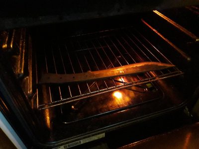 A fost efectuată în cuptorul aragazului. Cam trei ore la o temperatură de cca 200 de grade. Când lama a ajuns să aiba culoarea bronzului cu pete purpurii, a fost scoasă din cuptor. Însă la această operațiune a fost altă pățanie. La verificarea macetei, să văd culoarea potrivită, am scăpat-o din clește pe covorul din bucătărie. Era încinsă. A lăsat o urmă de toată frumusețea.