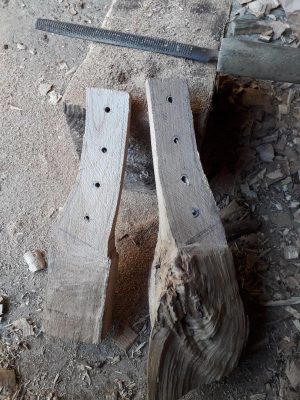 Confecţionat dintr-o bucată de lemn de stejar. Luat din grămada de lemne de foc. Cel puțin un an are de uscare. Și în acest caz cea mai mare parte a muncii a fost făcută manual. De teamă să nu iau prea mult din plăsele (s-a mai întâmplat) cu uneletele electrice, am preferat să folosesc rașpelul. Niturile sunt din sârmă mai groasă de aluminiu. Au fost bătute după lipirea plăselelor cu epoxy.